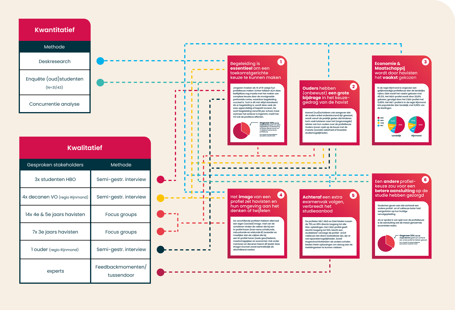 Met onderzoek ben ik gaan kijken naar de profielkeuze en hoe groot het probleem van profielkeuzespijt is. Uit het onderzoek kwamen o.a. inzichten die mij lieten zien dat de aansluiting op de vervolgopleiding een groter achterliggend probleem is dan de spijt zelf. Om die reden ben ik mezelf daarop gaan focussen. Mede omdat de toelatingseisen van opleidingen binnen Hogeschool Rotterdam soepeler, waardoor aansluiting meer een rol gaat spelen dan welk profiel je hebt.